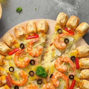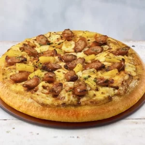 Nguyên liệu: Sốt cà chua, đế bánh (như trên), 150g phô mai bào sợi, ớt chuông xanh, hành tây, xúc xích, nấm rơm,
